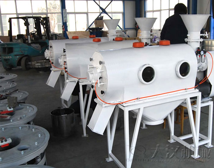 氣旋篩是將篩網(wǎng)放置在篩體內(nèi)部,麥芽粉通過螺旋輸送系統(tǒng)后,和氣流混合、霧化進(jìn)入圓通內(nèi),通過網(wǎng)筒內(nèi)風(fēng)輪葉片使麥芽粉同時(shí)收到離心力和旋風(fēng)推進(jìn)力,從而迫使麥芽粉噴射過網(wǎng),由細(xì)料排出口排出,不能過網(wǎng)的則沿筒壁從粗料排口排出,完成篩分工作。氣旋篩的體積非常小,質(zhì)量比較輕,運(yùn)行時(shí)平穩(wěn)無振動、無噪音、密封性較好,不會有粉塵的溢散,造成空氣的污染,同時(shí)也不會有污染物進(jìn)入,造成物料的不干凈,非常的適合篩分麥芽粉。